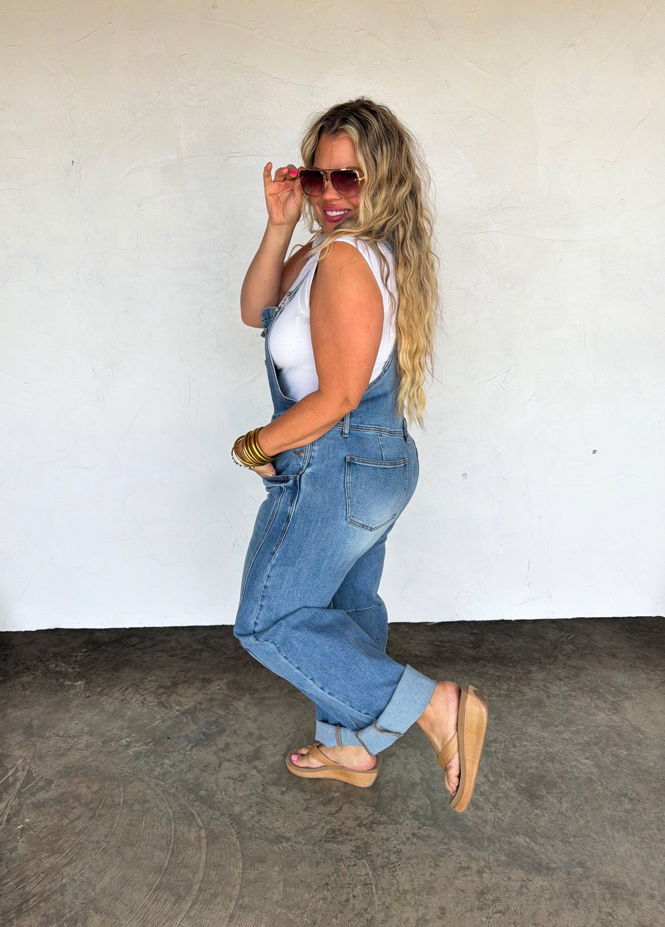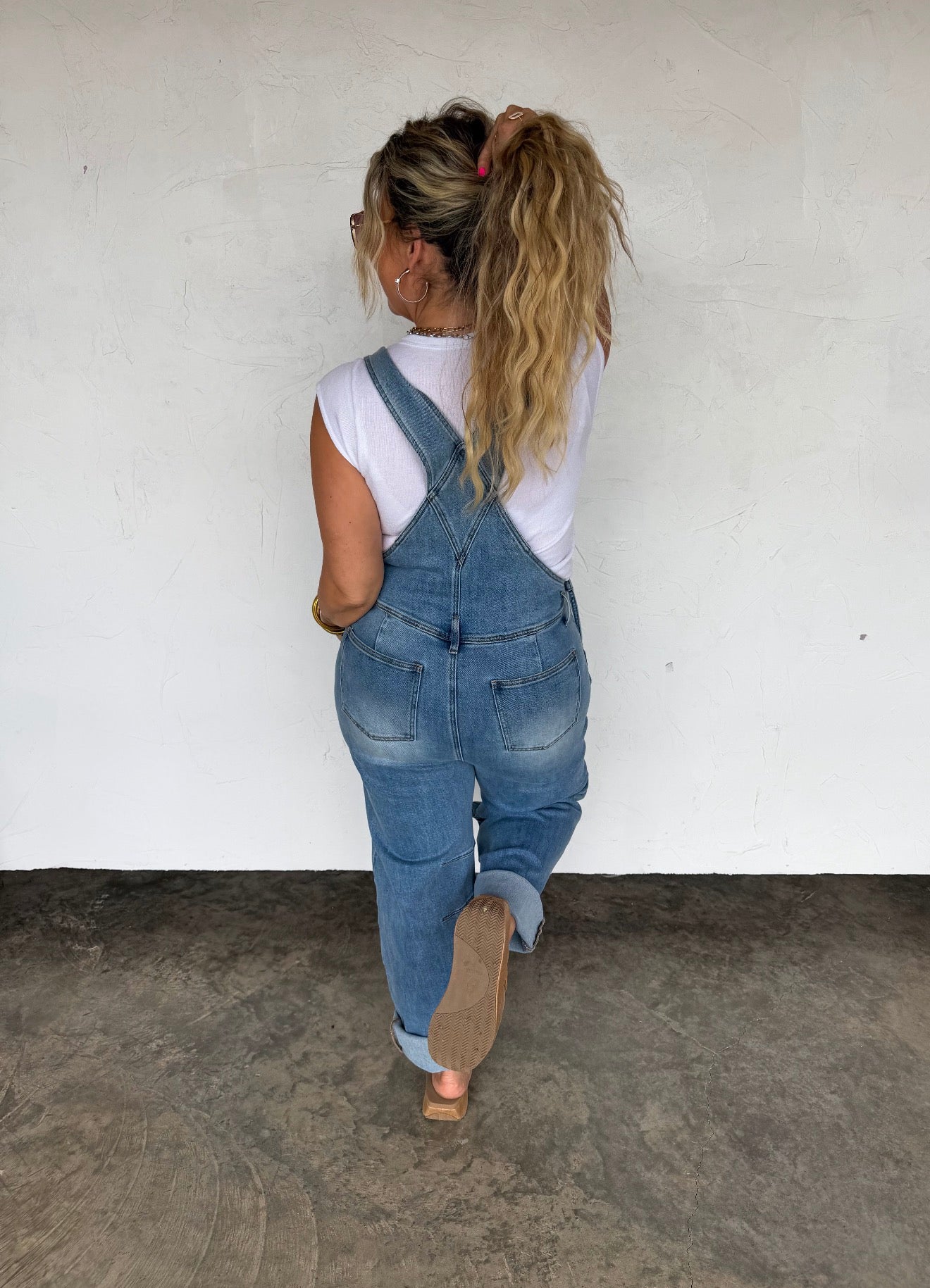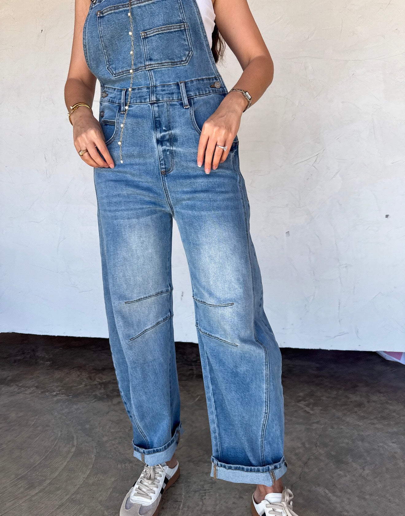 Features include side & back pockets, front bib pocket, darted knees, and adjustable straps. Stretchy denim fabric.