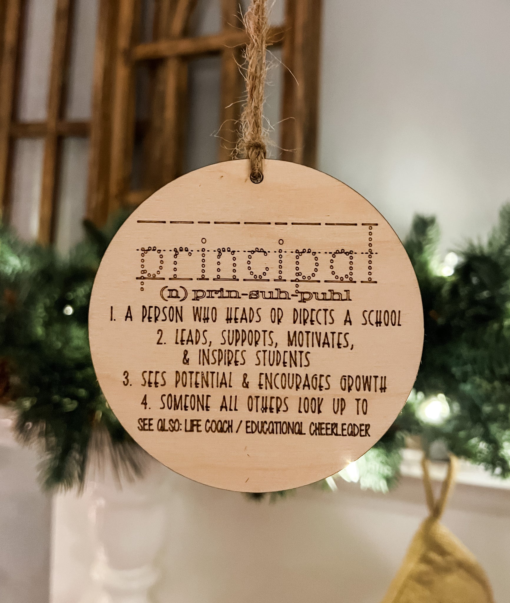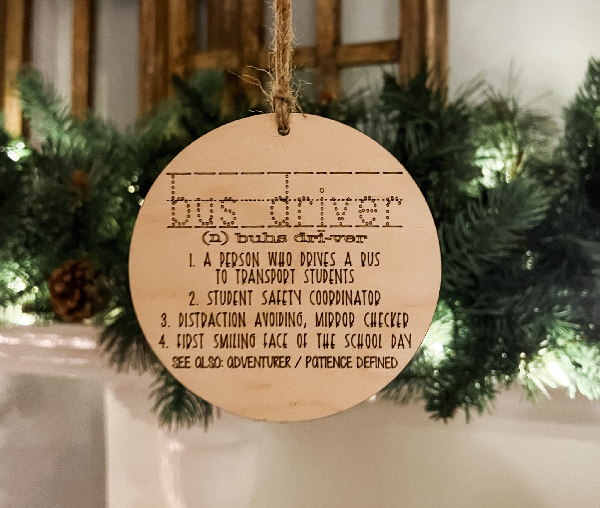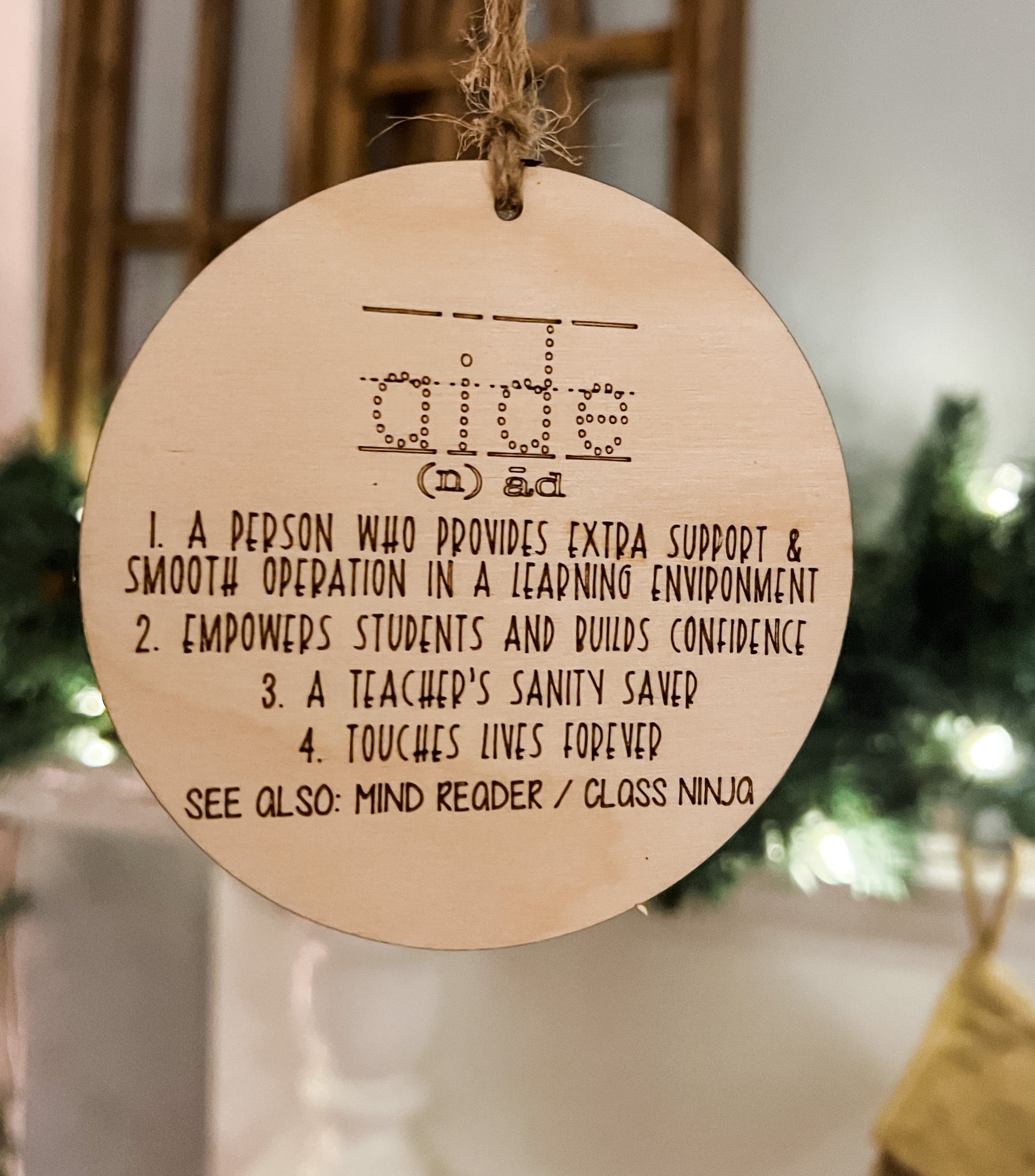 Laser engraved, wooden 3.75” ornament. Choice of aide, teacher, bus driver, counselor, custodian, librarian, lunch aide, or principal ornament. Comes as shown!