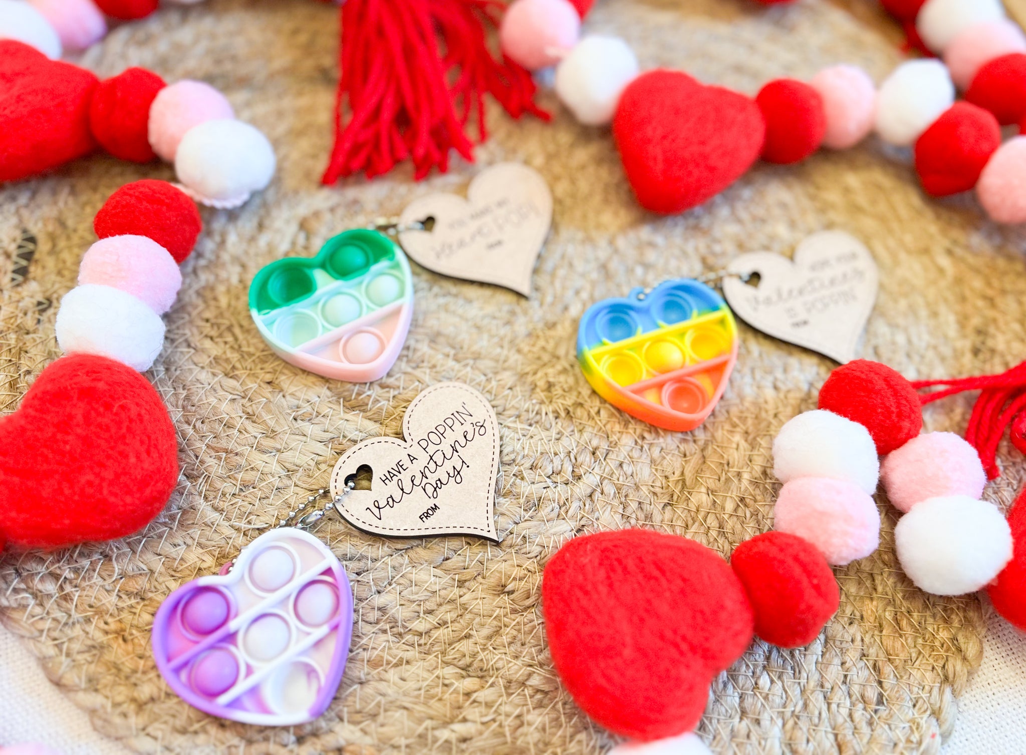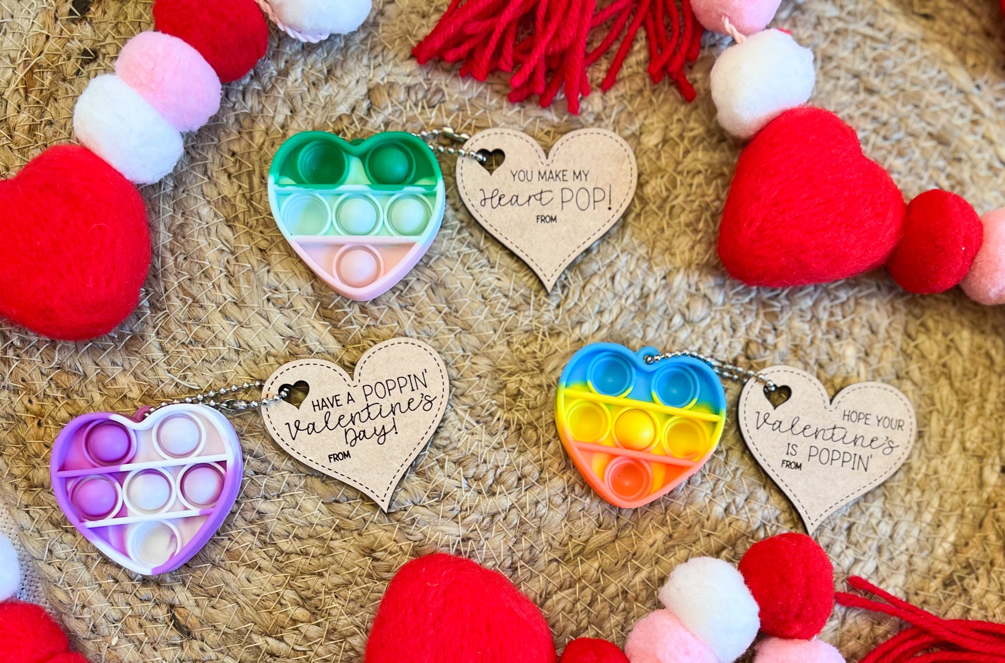 Pop fidget toy valentines, three different designs. Sayings and colors of hearts will vary. Each laser engraved card comes with a pop it toy in a random pattern