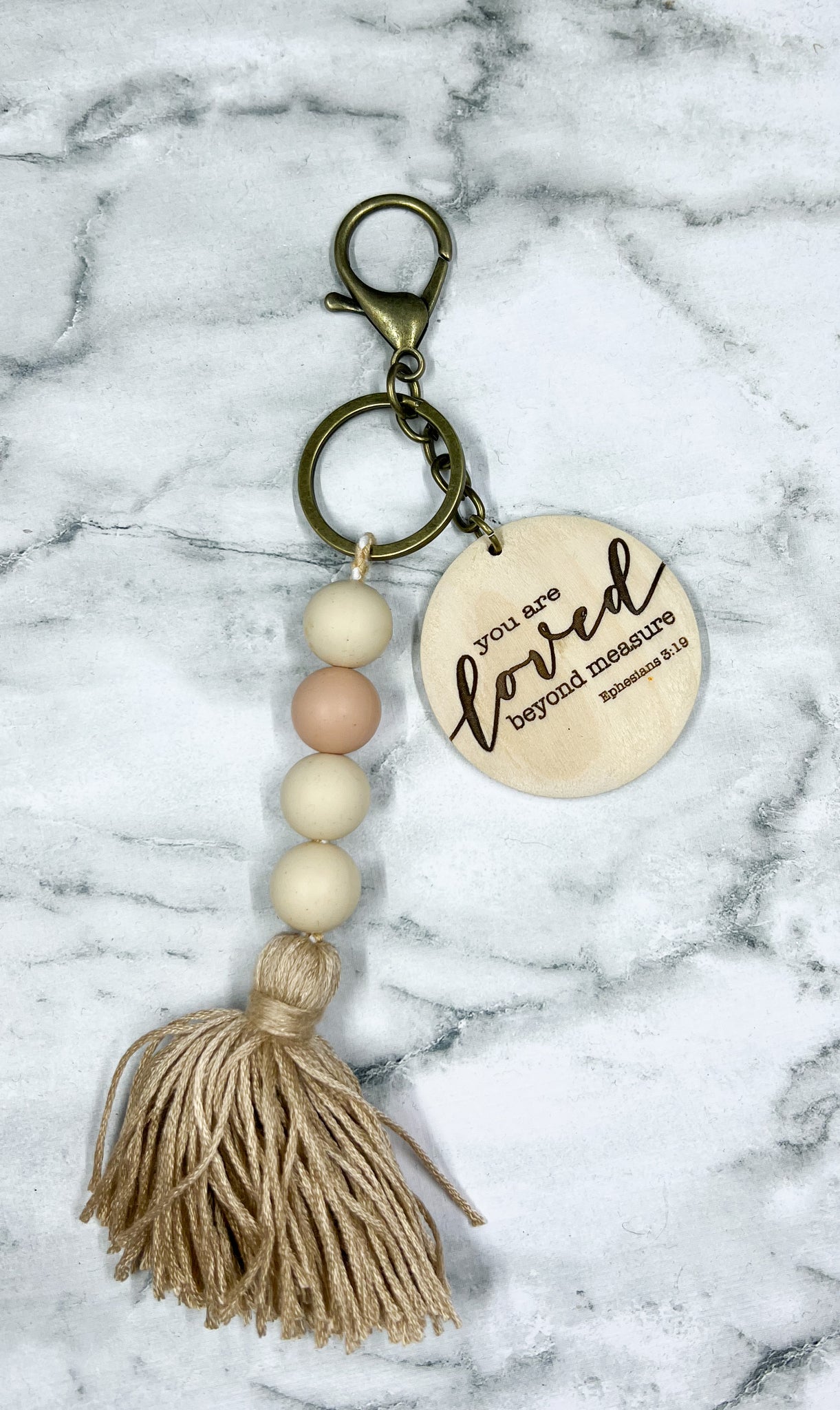 15mm silicone bead keychain with thread tassel and pendant. Keychain is adorned with antique brass keyring and accents. Wooden disc is laser engraved.